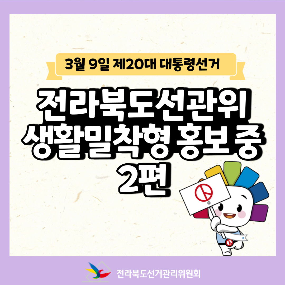 전라북도선거관리위원회 홍보과(063-239-2350)에서 제작한 전라북도선거관리위원회 생활밀착형 홍보 중 2편 저작물은 "공공누리" 출처표시-상업적 이용금지-변경금지 조건에 따라 이용할 수 있습니다. 자세한 내용은 [저작권정책]을 확인하십시오.