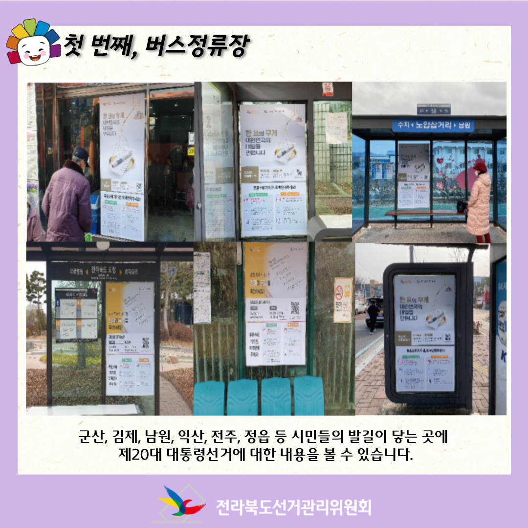 군산, 김제, 남원, 익산, 전주, 정읍 등 시민들의 발길이 닿는 곳에 제20대 대통령선거에 대한 내용을 볼 수 있습니다.