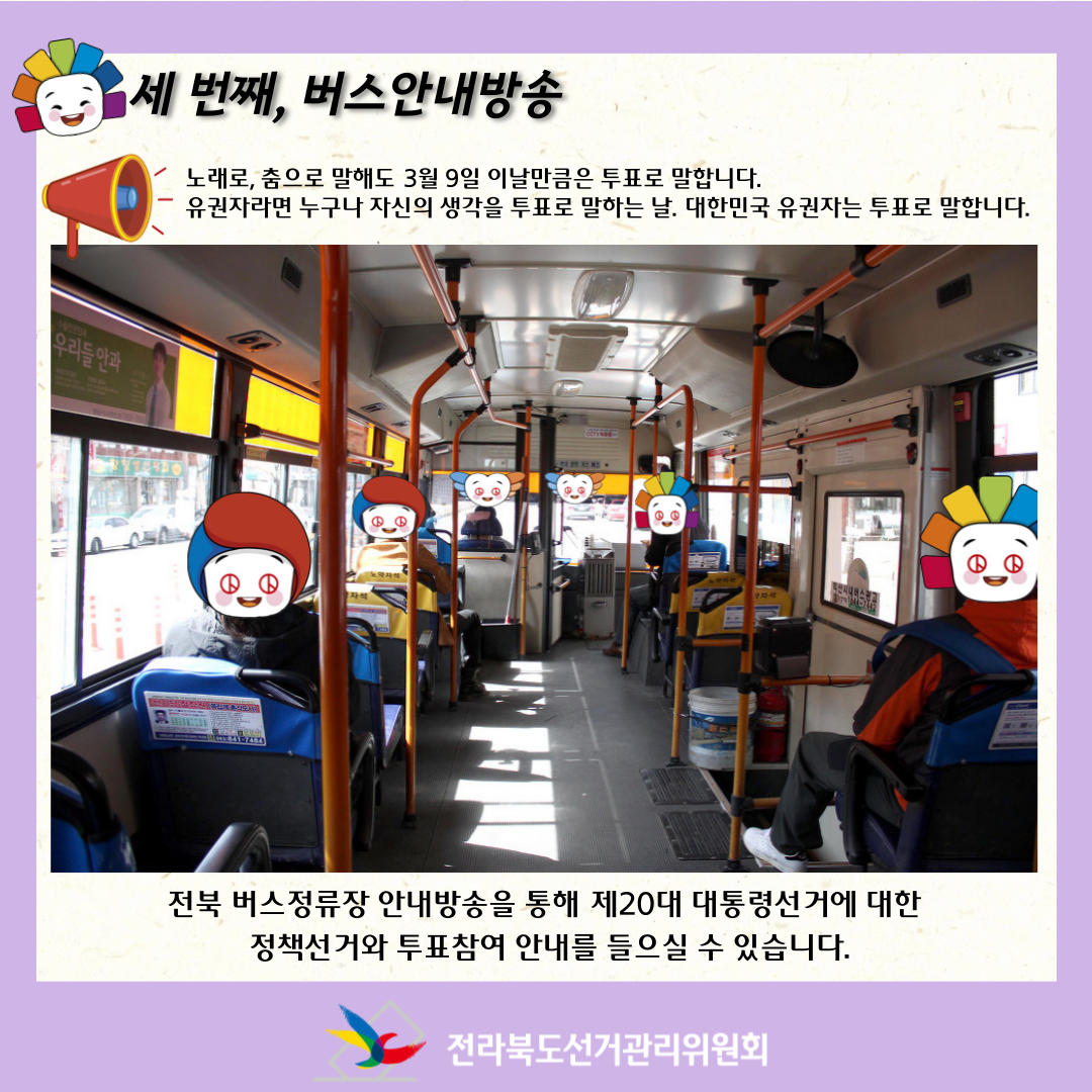 전북 시내버스에서 안내방송을 통해 제20대 대통령선거에 대한 정책선거와 투표참여 안내를 들으실 수 있습니다.