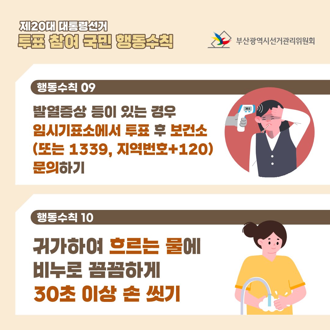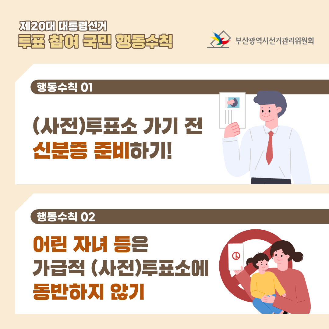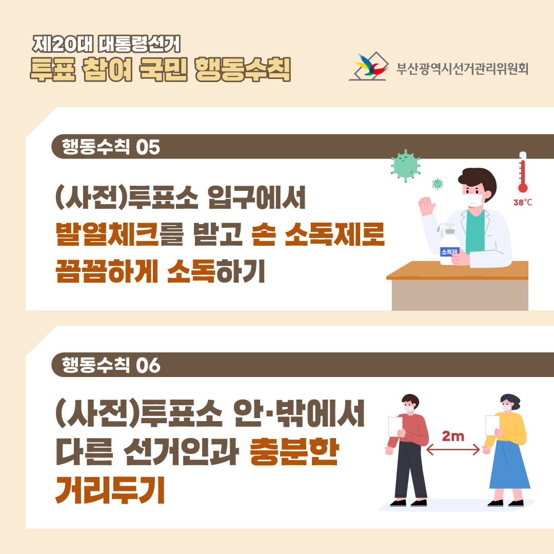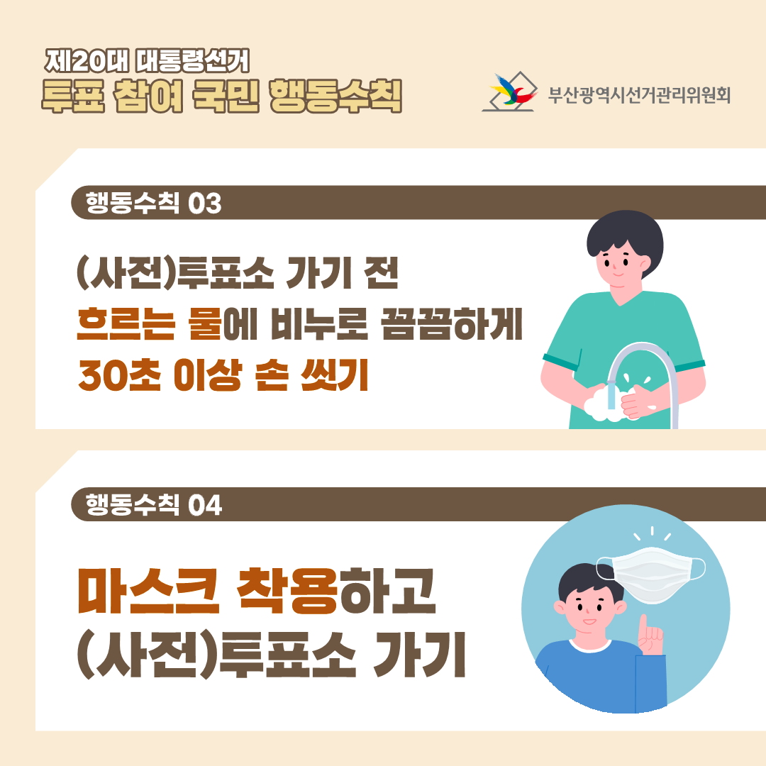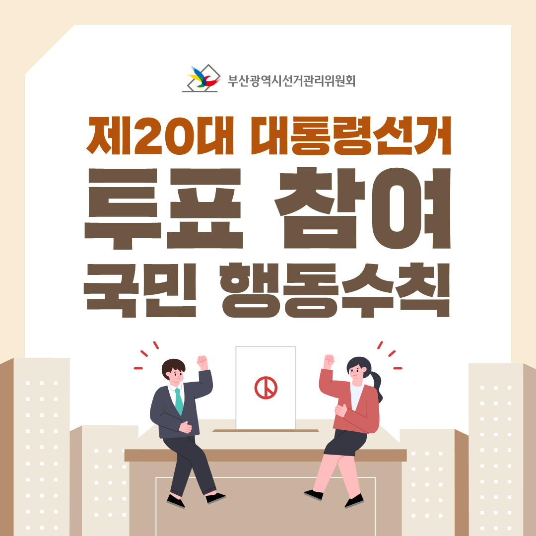 부산광역시선거관리위원회(0518517770)에서 제작한 제20대 대통령선거 카드뉴스 - 투표 참여 국민 행동수칙 저작물은 "공공누리" 출처표시 조건에 따라 이용할 수 있습니다. 자세한 내용은 [저작권정책]을 확인하십시오.