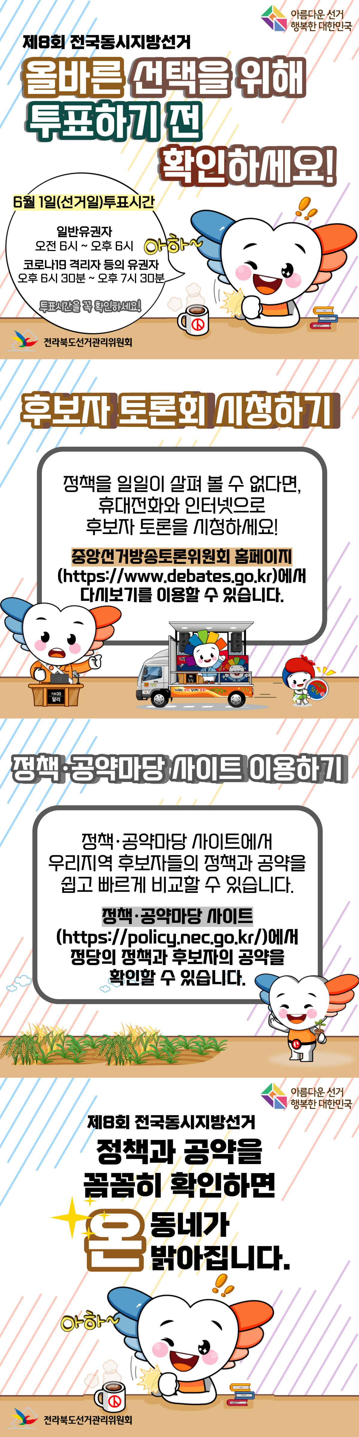 제8회 전국동시지방선거 올바른 선택을 위해 투표하기 전 확인하세요! 6월 1일(선거일)투표시간 일반유권자 오전 6시 ~ 오후 6시 코로나19 격리자 등의 유권자 오후 6시 30분 ~ 오후 7시 30분 투표시간을 꼭 확인하세요! 후보자 토론회 시청하기 정책을 일일이 살펴 볼 수 없다면, 휴대전화와 인터넷으로 후보자 토론을 시청하세요! 중앙선거방송토론위원회 홈페이지(https://www.debates.go.kr)에서 다시보기를 이용할 수 있습니다. 정책 공약마당 사이트 이용하기 정책 공약마당 사이트에서 우리지역 후바자들의 정책과 공약을 쉽고 빠르게 비교할 수 있습니다. 정책 공약마당 사이트 (https://policy.nec.go.kr/)에서 정당의 정책과 후보자의 공약을 확인할 수 있습니다. 제8회 전국동시지방선거 정책과 공약을 꼼꼼히 확인하면 온동네가 밝아집니다.