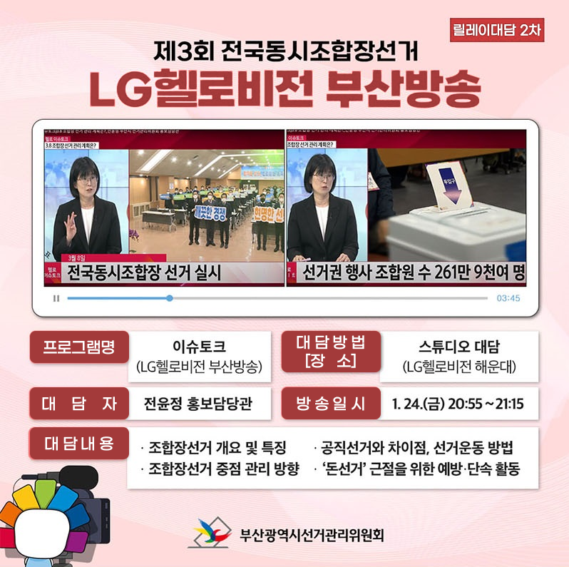 부산시선관위에서는 제3회 전국동시조합장선거 안내를 위하여 부산지역 유선방송사와 3차례에 걸쳐 릴레이대담을 실시하였습니다.
