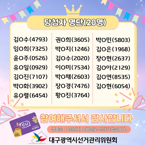 오답자 및 중복응답자를 제외한 20명의 당첨자를 선정했습니다.