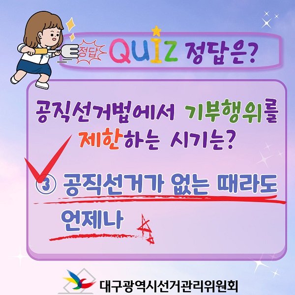 대구광역시선거관리위원회(053-767-2584)에서 제작한 대구시선거관리위원회 기부행위 상시 제한·금지 문제풀이 이벤트 당첨자발표 저작물은 "공공누리" 출처표시-상업적 이용금지-변경금지 조건에 따라 이용할 수 있습니다. 자세한 내용은 [저작권정책]을 확인하십시오.