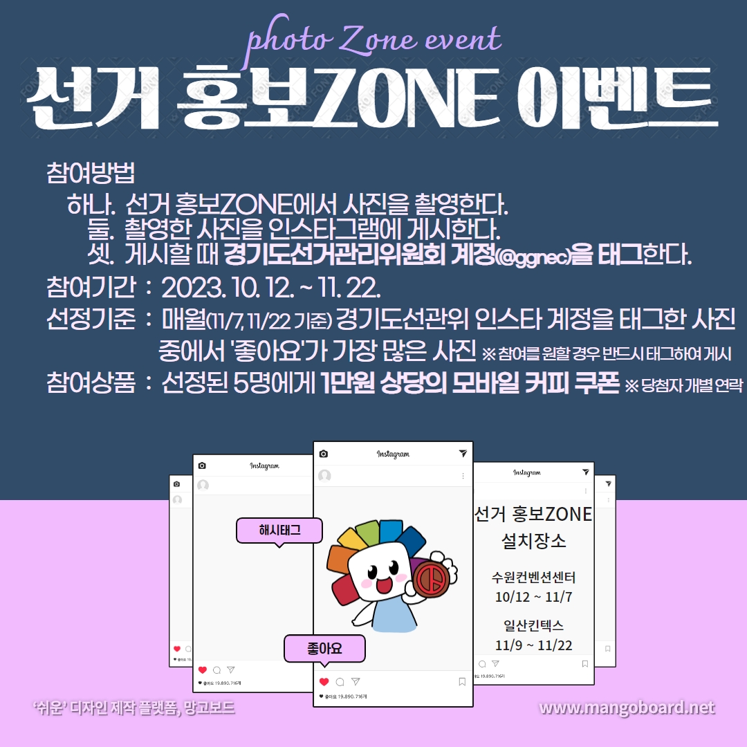 1. 참여방법 : 선거 홍보ZONE에서 촬영한 사진을 인스타에 업로드 해주세요! 업로드 할때는 ★반드시★ 경기도선거관리위원회 계정(@ggnec )을 태그!