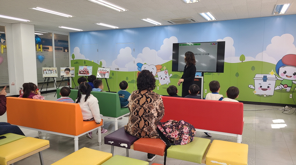 * 사진설명 : 푸른솔어린이집 11명의 원아들과 교사 2명이 서울특별시선거관리위원회 선거체험관 강의존에서 민주시민교육 강사의 강의를 경청하고 있다.