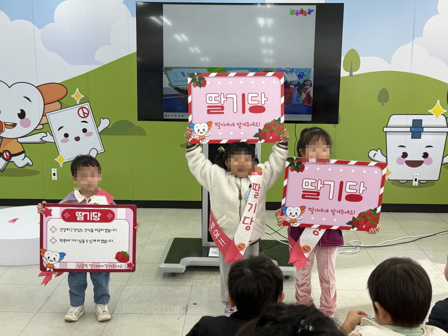 * 사진설명 : 원아 3명이 선거체험관 강의존에서 각자의 피켓을 들고 선거운동 체험을 하고 있다.