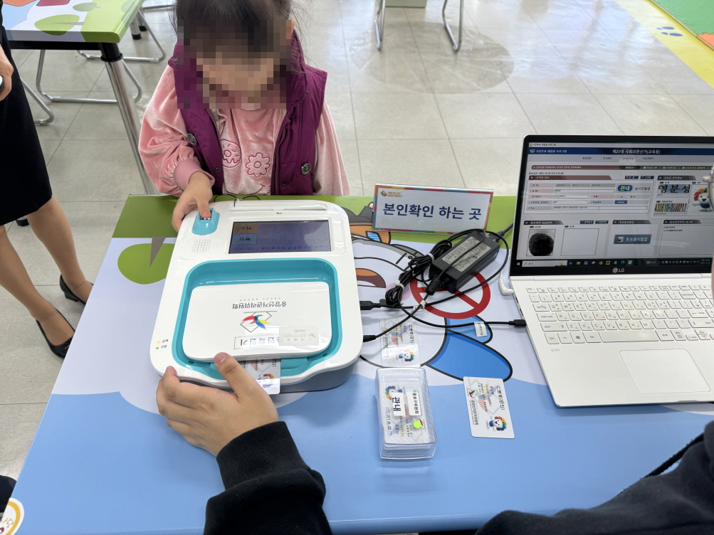 * 사진설명 : 선거체험관 체험존에서 한 원아가 본인확인기에 손도장을 찍고 있다.