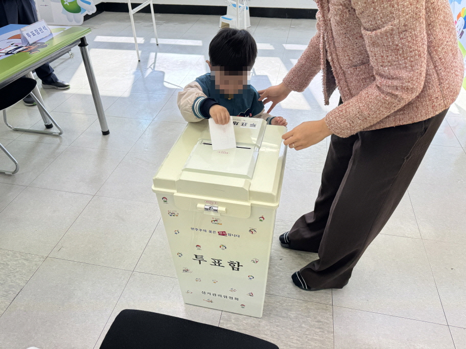 * 사진설명 : 체험존 기표소에서 기표를 마친 한 원아가 투표함에 투표지를 넣고 있다.