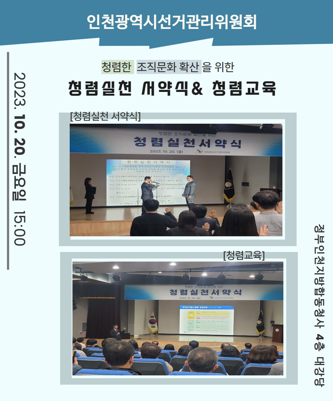 인천광역시선거관리위원회 청렴한 조직문화 확산을 위한 청렴실천 서약식 & 청렴교육 2023. 10.20. 금요일 15:00 정부인천지방합동청사 4층 대강당 (첫번째 사진) 청렴실천 서약식 (두번째 사진) 청렴교육