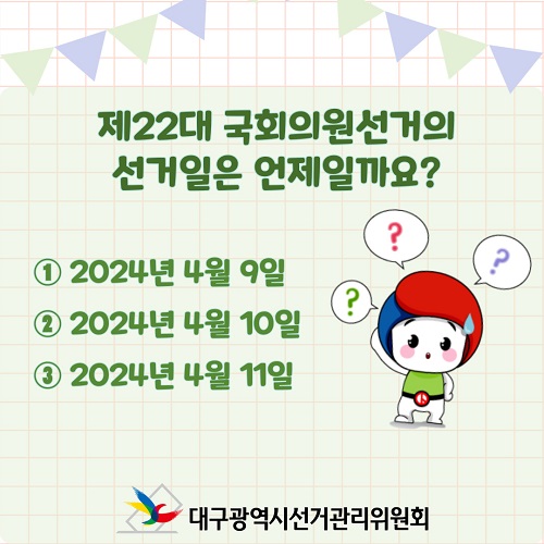 대구광역시선거관리위원회(053-767-2584)에서 제작한 제22대 국회의원선거 문제풀이 이벤트 저작물은 "공공누리" 출처표시-상업적 이용금지-변경금지 조건에 따라 이용할 수 있습니다. 자세한 내용은 [저작권정책]을 확인하십시오.