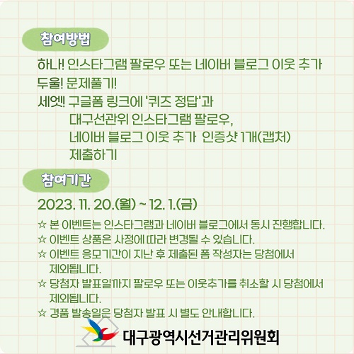 힌트) 2023. 11. 20.에 대구시선관위 공식 인스타그램, 네이버블로그와 대구광역시선거관리위원회 홈페이지에