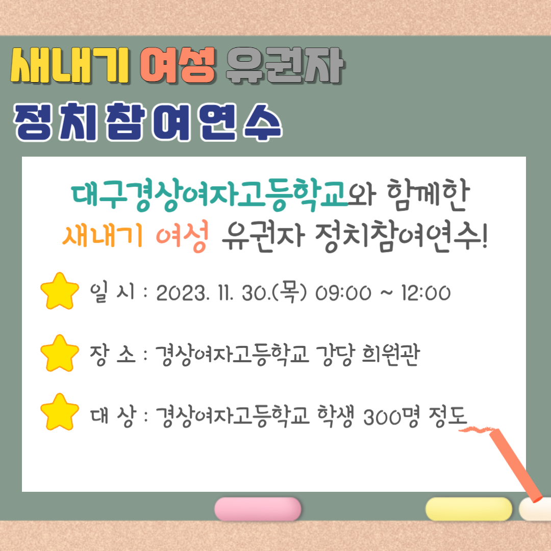 2023. 11. 30. 대구경상여자고등학교에서 새내기 여성 유권자 정치 참여 연수를 실시하였습니다!