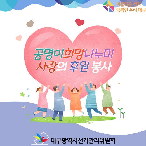 대구광역시선거관리위원회(053-767-2584)에서 제작한 대구광역시선거관리위원회 공명이희망나누미 후원 봉사 실천! 저작물은 "공공누리" 출처표시-상업적 이용금지-변경금지 조건에 따라 이용할 수 있습니다. 자세한 내용은 [저작권정책]을 확인하십시오.