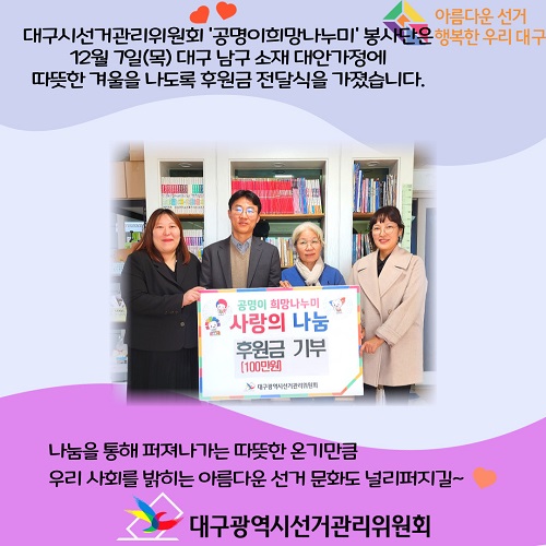 대구시선거관리위원회 '공명이희망나누미 봉사단은 행복한 우리 대구 12월 7일(목) 대구 남구 소재 대안가정에 따뜻한 겨울을 나도록 후원금 전달식을 가졌습니다.