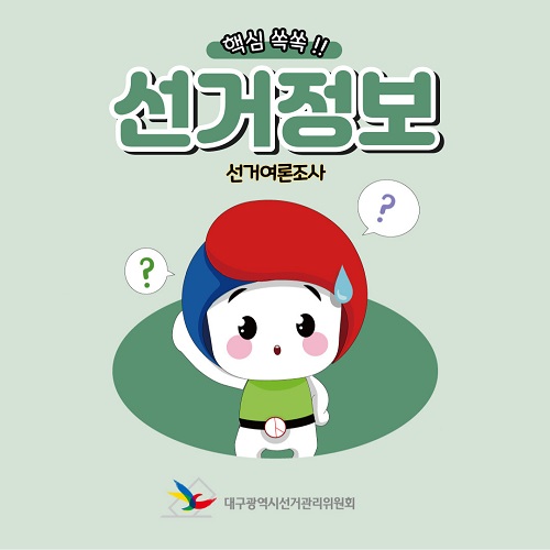 대구광역시선거관리위원회(053-767-2584)에서 제작한 핵심쏙쏙!! 선거정보(선거여론조사) 저작물은 "공공누리" 출처표시-상업적 이용금지-변경금지 조건에 따라 이용할 수 있습니다. 자세한 내용은 [저작권정책]을 확인하십시오.
