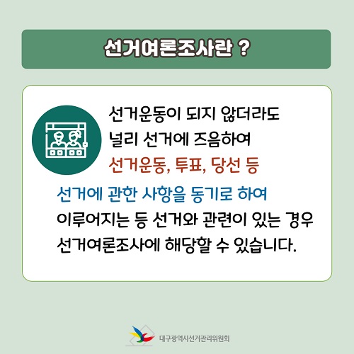 • 금지행위 : 투표용지와 유사한 모형을 사용하거나 정당(창당준비위원회 포함) 또는 후보자(후보자가 되려는 사람 포함)의 명의로 선거에 관한 여론조사를 할 수 없음