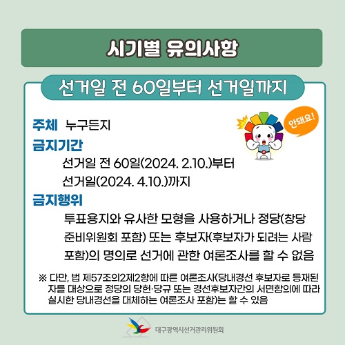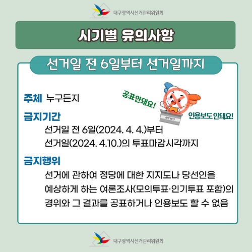 • 금지기간 : 선거일 전 6일(2024. 4. 4.)부터 선거일(2024. 4.10.)의 투표마감시각까지