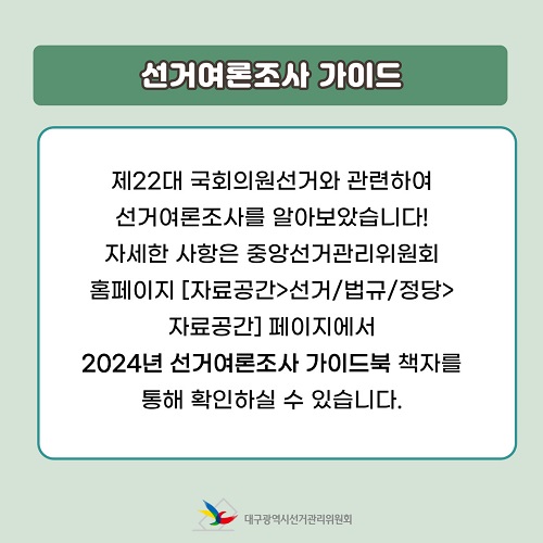 자세한 사항은 중앙선거관리위원회 홈페이지 [자료공간>선거/법규/정당>자료공간] 페이지에서 2024년 선거여론조사 가이드북 책자를 통해 확인하실 수 있습니다.