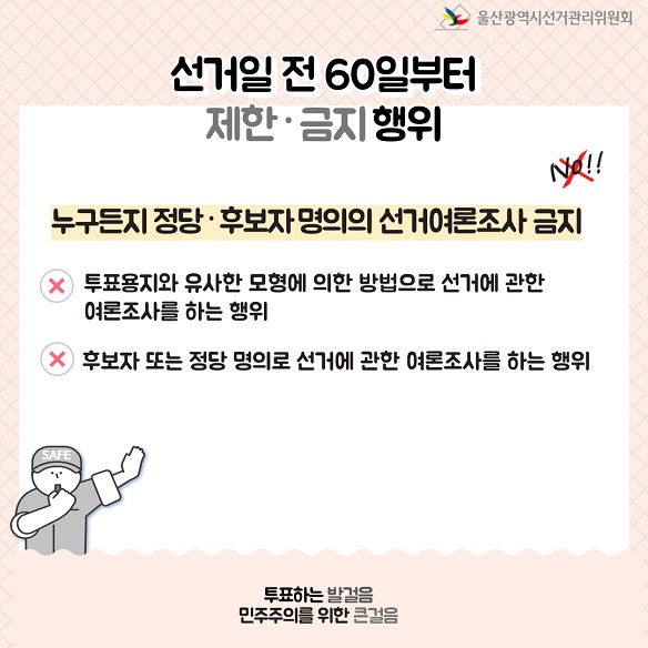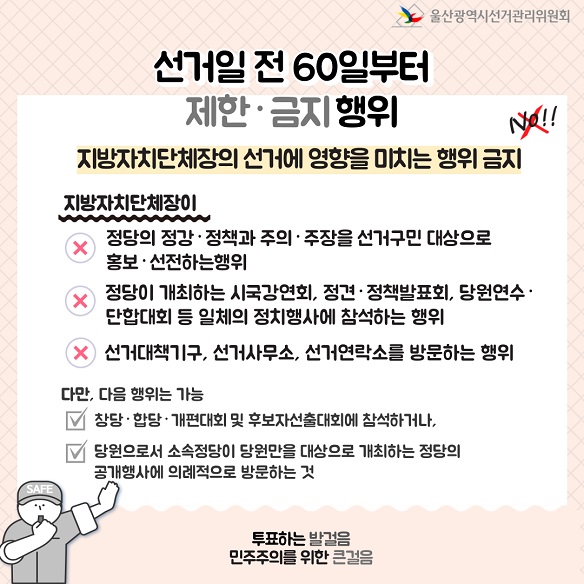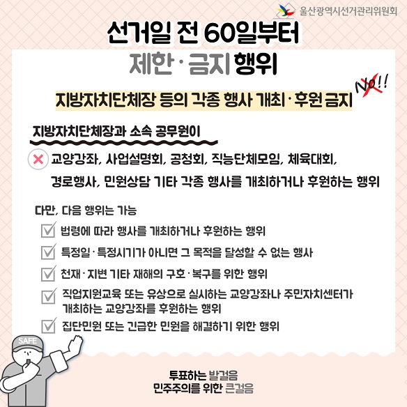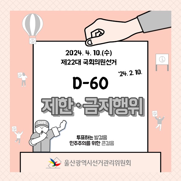 울산광역시선거관리위원회(052-290-0757)에서 제작한 제22대 국회의원선거 D-60 제한·금지 행위 안내 저작물은 "공공누리" 출처표시-상업적 이용금지-변경금지 조건에 따라 이용할 수 있습니다. 자세한 내용은 [저작권정책]을 확인하십시오.
