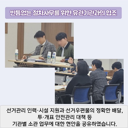 먼저, 최적의 선거관리 체제 구축을 위한 유관기관과의 업무협의회부터 살펴볼까요?