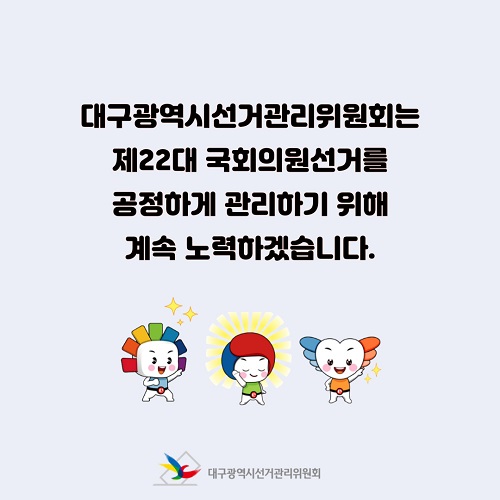 대구광역시선거관리위원회는 제22대 국회의원선거를 공정하게 관리하기 위해 계속 노력하겠습니다.