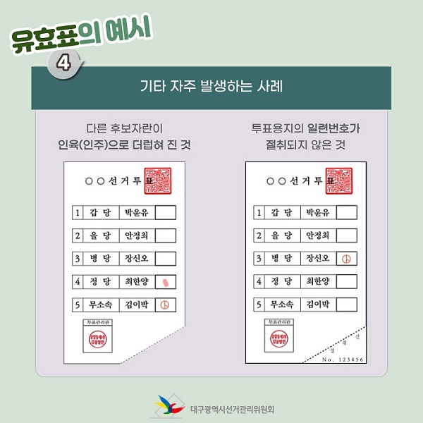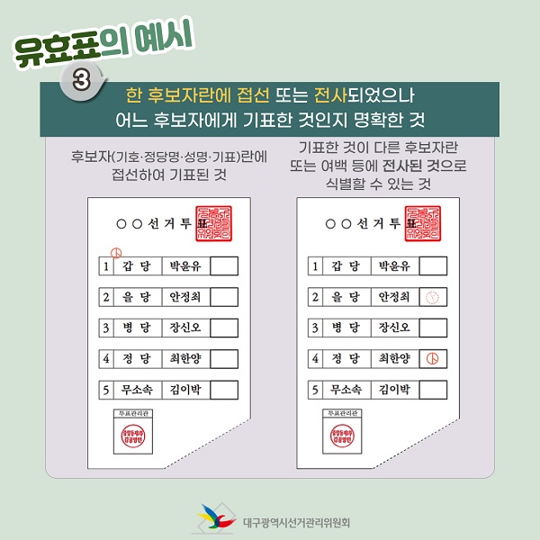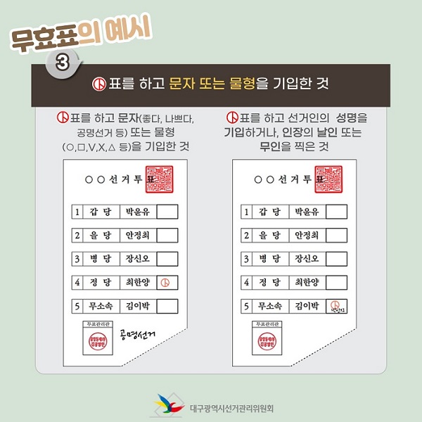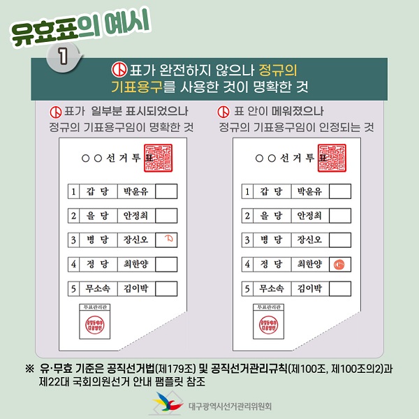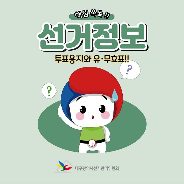 대구광역시선거관리위원회(053-767-2584)에서 제작한 핵심쏙쏙!! 선거정보(투표용지와 유효표, 무효표) 저작물은 "공공누리" 출처표시-상업적 이용금지-변경금지 조건에 따라 이용할 수 있습니다. 자세한 내용은 [저작권정책]을 확인하십시오.