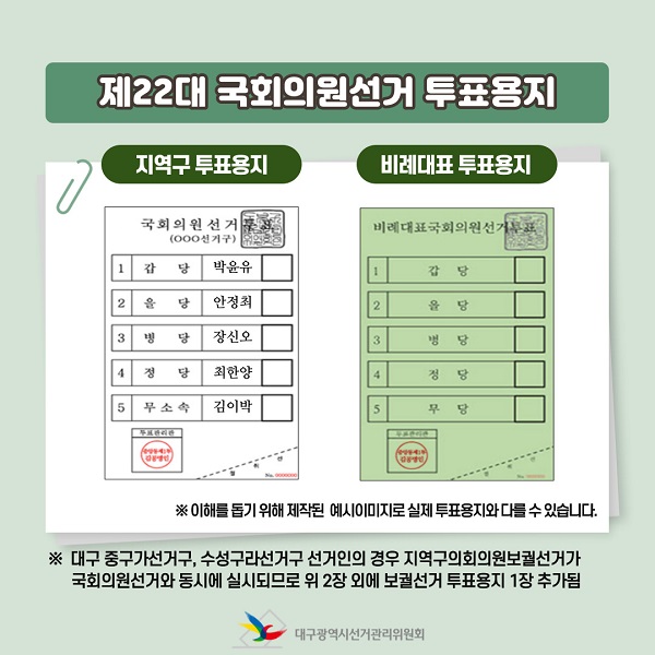 제22대 국회의원선거의 투표용지는 지역구 국회의원 투표용지, 비례대표 국회의원 투표용지 2장을 받습니다.