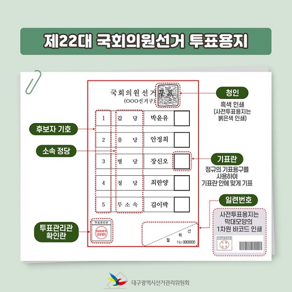 제일 먼저 선거명과 청인이 있습니다. 청인은 선거일(4월 10일) 투표용지는 흑색으로 인쇄되며,