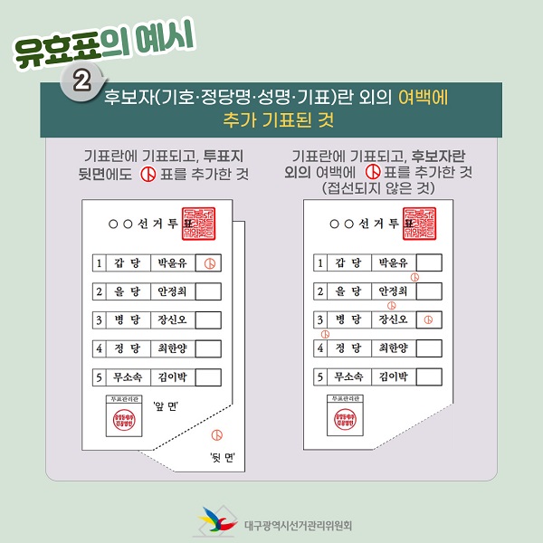 유효표의 예시2. 후보자(기호·정당명·성명·기표)란 외의 여백에 추가 기표된 것