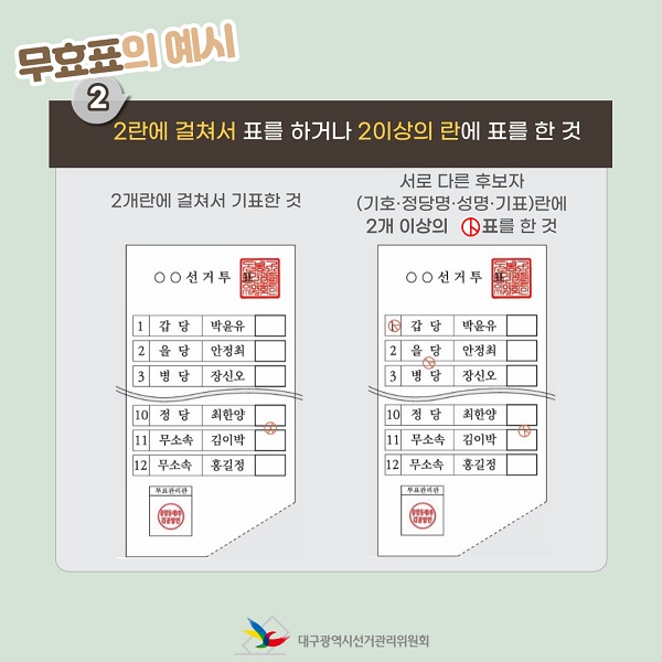 - 서로 다른 후보자(기호·정당명·성명·기표)란에 2개 이상의 기표마크를 한 것