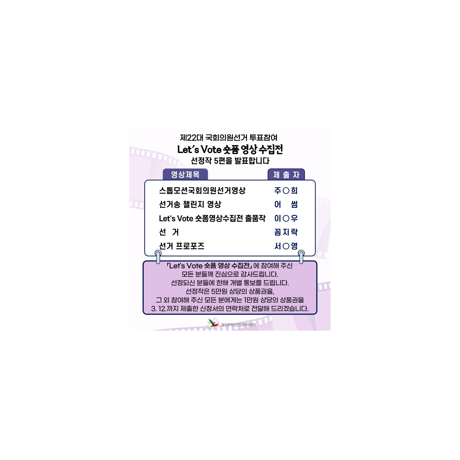 「Let's Vote 숏폼 영상 수집전」에 참여해 주신 모든 분들께 진심으로 감사드립니다.