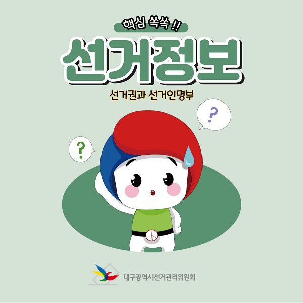 대구광역시선거관리위원회(053-767-2584)에서 제작한 핵심쏙쏙!! 선거정보(선거권과 선거인명부) 저작물은 "공공누리" 출처표시-상업적 이용금지-변경금지 조건에 따라 이용할 수 있습니다. 자세한 내용은 [저작권정책]을 확인하십시오.