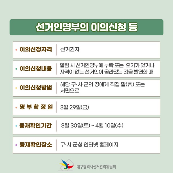 이의신청내용 : 열람 시 선거인명부에 누락 또는 오기가 있거나 자격이 없는 선거인이 올라있는 것을 발견한 때