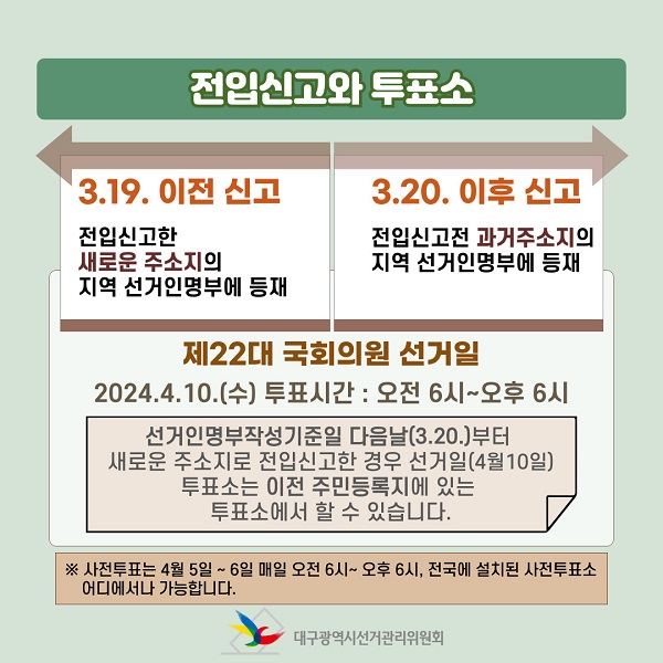 선거인명부작성기준일 다음날(3.20.)부터 새로운 주소지로 전입신고한 경우 선거일(4월10일) 투표소는 이전 주민등록지에 있는 투표소에서 할 수 있습니다.