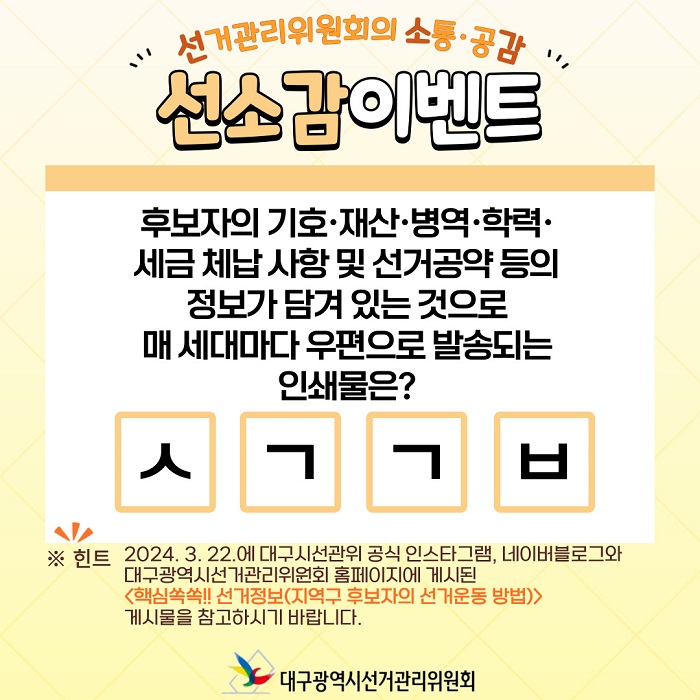 ※ 힌트) 2024. 3. 22.에 대구시선관위 공식 인스타그램, 네이버블로그와 대구광역시선거관리위원회 홈페이지에 게시된 <핵심쏙쏙!! 선거정보(지역구 후보자의 선거운동 방법)>게시물을 참고하시기 바랍니다.