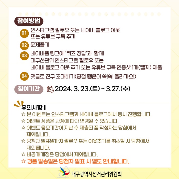 ① 대구선관위 인스타그램 팔로우, 네이버 블로그 이웃추가 또는 유튜브 구독을 한다.
